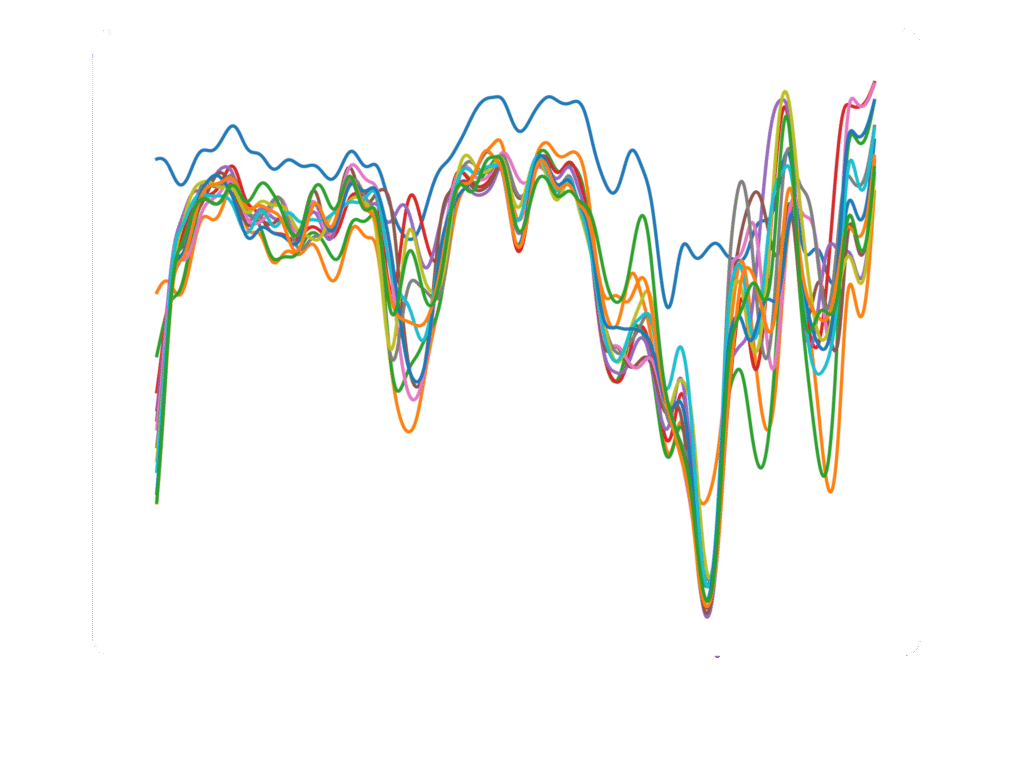 In a tempogram, time runs left to right, while tempo (beats per minute) rises vertically. The lines you see trace how rhythmic strength shifts across different speeds. Each curve represents a rhythmic pattern living inside the sound — like layers of motion intertwined.